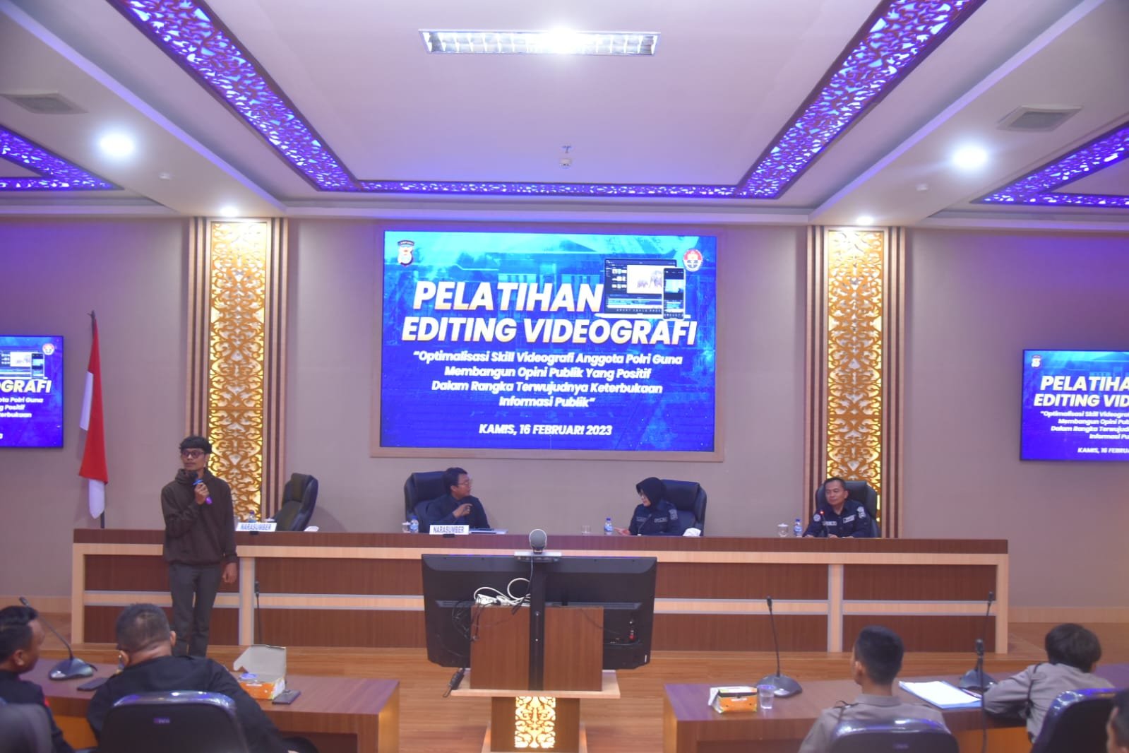 TINTAINFORMASI.COM, LAMPUNG SELATAN – Bidang Hubungan Masyarakat (Bidhumas) Polda Lampung, Kabid Humas Polda Lampung Kombes Pol Zahwani Pandra Arsyad,.SH.M.Si., Mengadakan Kegiatan pelatihan Ketrampilan dan Etika Pelayanan Publik Serta Kemampun komunikasi Digital anggota Polri dalam berinteraksi melalui media digital. kamis (16/2/2023). Bertempat di ruang Rupatama Polda Lampung hadir dalam kegiatan Kasubbid Penmas AKBP Rahmad Hidayat SE MM., Kasubbid Multimedia AKBP Agustin Anjar .A.Md., kasubbid PID Kompol Andri Yuliyanto.S.Kom., Kasubag Renmin Kompol Agustinus R .S.H.M.H. Bahwa kegiatan ini dilaksanakan guna menunjang kemampuan anggota polri dalam berinteraksi maupun komunikasi dimana di era digital sekarang semakin mudah untuk mendapatkan informasi serta berita. Pelatihan ini diikuti sebanyak 60 Personil terdiri dari 30 Personil Satker Polda Lampung serta 30 Personil Bintara Ramaja angkatan 48 Tahun 2022. Menjadi narasumber dalam kegiatan Dr.(c). Ariesetya Putra Ca.S.Kom .M.T.I., memberikan Pelatihan Keterampilan dan Etika Pelayanan Publik Serta Kamampun Digital dari Universitas Umitra Lampung dan Dimas Lutfi Prayoga A.md., sebagai Narasumber Optamilisasi Skill Vidio Grapis dari Universitas Itera Lampung. Saat berlangsung kegiatan Kapolda Lampung Irjen Pol Dr Akhmad Wiyagus,.SIK .M.SI M.M., didampingi Karo Ops Polda Lampung Kombes Pol Reomtaat,.S.Ik menyempatkan hadir untuk memberikan motivasi kepada peserta pelatihan Keterampilan dan Etika Pelayanan Publik Serta Kamampun digital di Rupatama Polda Lampung “Agar dapat Menyerap Materi yang Di berikan Narasumber diharapkan kepada peserta untuk mengikuti dengan seksama Dan Bersungguh-sungguh dalam Melaksanakan nya” ucapnya Menambahkan dalam kesempatan yang sama Kabid Humas Kombes Pandra menyampaikan “Bahwa Polri Sebagi Tribarata dan Catur Prasetya merupakan Pelindung Pengayom dan Pelayanan Masyarakat dapat Menjadi Pemecah Masalah Dalam Masyarakat yang ingin di sampaikan Kita ini sedang menjalankan progam quick wins presisi artinya percepatan yang semakin cepat dan harus cepat dan tepat” Penekanan Kabidhumas bahwa di Era Digital & Era Keterbukaan Informasi Publik, Maka Setiap Anggota Polri yang betugas harus berlandaskan Jiwa Tri Brata & Catur Prasetya yaitu betindak sebagai Pelindung, Pengayom dan Pelayan Masyarakat “kepada Peserta Pelatihan Semoga dapat Menyerap apa Yang Di Sampaikan Oleh Narasumber Kita Tentang Pelatihan Keterampilan dan Etika Pelayanan Publik Serta Kamampun Di Gital dan Narasumber Optamilisasi Skill Vidio Grapis” ujar Pandra (*)