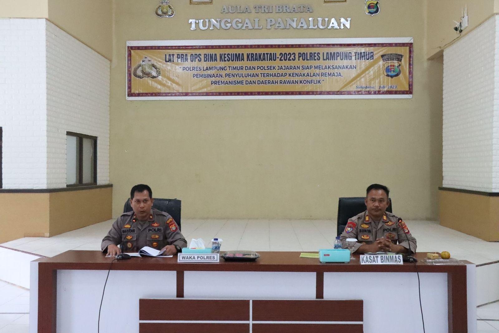Dalam arahannya, Kapolres Lampung Timur AKBP M. Rizal Muchtar yang diwakili Wakapolres menjelaskan, Operasi Kepolisian ini dilaksanakan selama 12 hari, terhitung dari tanggal 25 Juli 2023 s/d 05 Agustus 2023, yang bertujuan untuk melakukan pembinaan serta penyuluhan terhadap sasaran kenakalan remaja, premanisme, dan daerah rawan konflik di Kabupaten Lampung Timur.