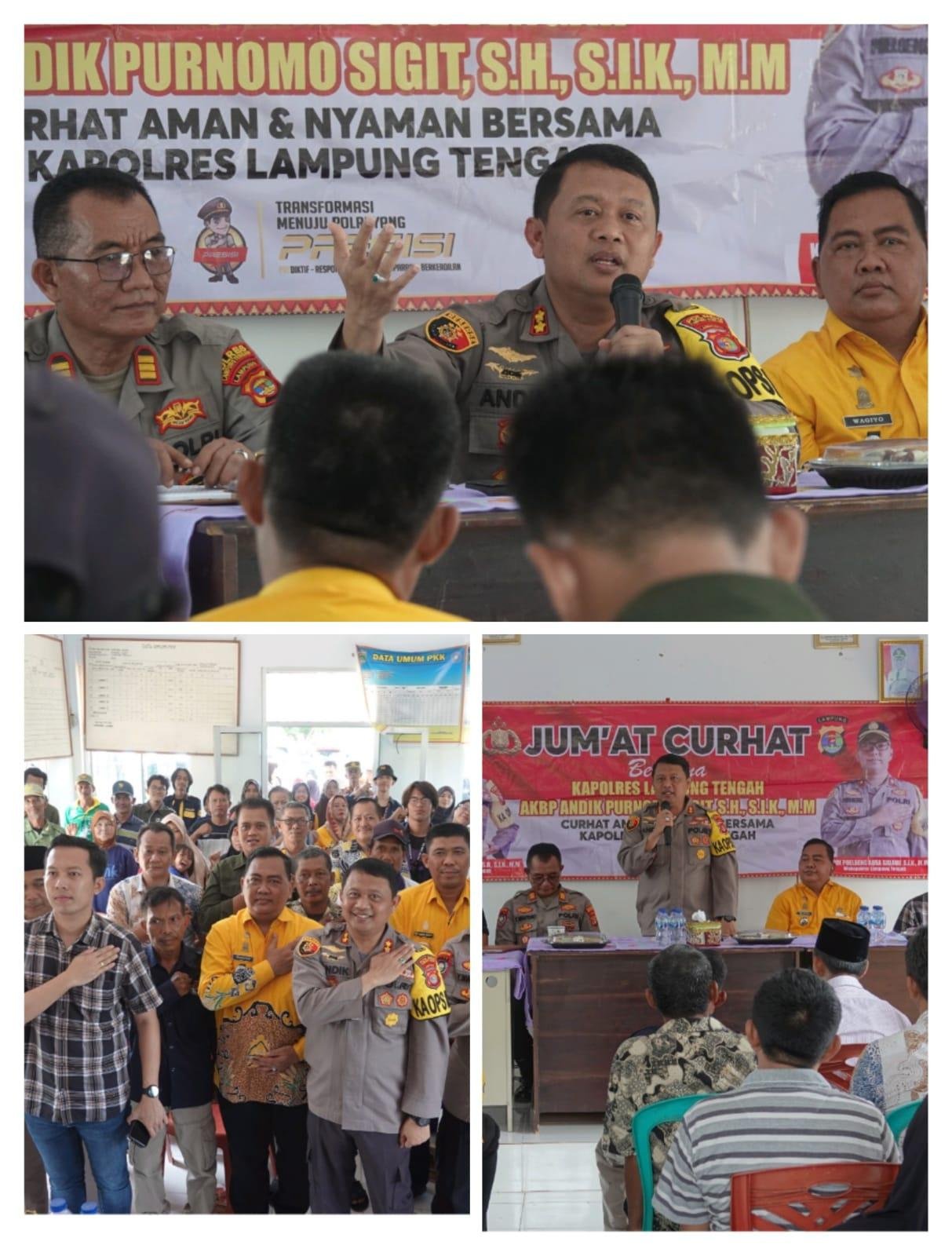 TINTAINFORMASI.COM, LAMPUNG TENGAH – Bertempat di aula Balai Kelurahan Komering Agung Kecamatan Gunung Sugih Kabupaten Lampung Tengah, Kapolres Lampung Tengah, Polda Lampung AKBP Andik Purnomo Sigit, S.H., S.I.K., M.M kembali menggelar program Jumat curhat. Jumat (5/1/24)