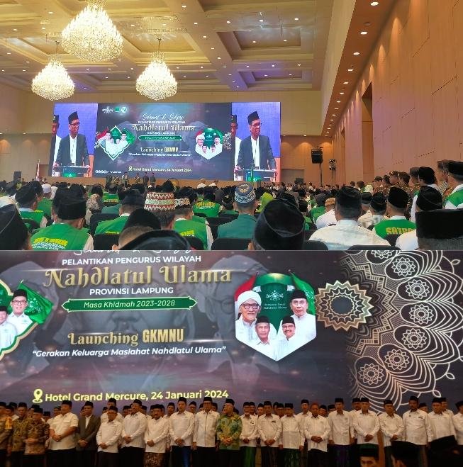 TINTAINFORMASI.COM, LAMPUNG – Pengurus Wilayah Nahdlatul Ulama (PWNU) Provinsi Lampung menggelar pelantikan dan pembuatan pengurus wilayah masa Khidmah 2023 – 2028, dan launching Gerakan Keluarga Maslahat Nahdlatul Ulama (GKMNU), Di Grand Mall Lampung, Rabu (24/01/2024). pembaitan pengurus NU Lampung dilakukan oleh Wakil Ketua Umum PBNU Kiayi H. Amin Said Husni. Hadir pada acara tersebut, Gubernur Lampung, Bupati, Walikota, Kementrian Agama RI, Anggota DPRD, DPR RI, DPD., Kapolda Lampung, Dandrem, Ketua Muhammadiyah Lampung, seluruh pengurus NU Lampung dan lain – lain. Dalam sambutanya, Ketua Umum di Wakili Wakil Ketua Umum PBNU, Kiayi H. Amin Said Husni, mengucapkan alhamdulilah kepada tamu undangan yang telah hadir pada acara pelantikan pengurus NU Provinsi Lampung. “Atas nama besar NU saya mengucapkan selamat kepada para pengurus NU yang baru dilantik,” katanya. Dalam kesempatan itu, beliau juga mengucapkan permohonan maaf atas nama Ketua Umum NU yang tidak bisa hadir. Ia menjelaskan, Ketua Umum PBNU sedang memeprsiapkan diri pada penerimaan penghargaan besar yaitu Zaid Word. PBNU memperoleh penghargaan ini atas dasar kekonsenan dan keperdulian NU serta aksi – aksi nyata yang telah dibuktikan dalam memperjuangkan nilai – nilai kemanusiaan di dunia khususnya di Indonesia.